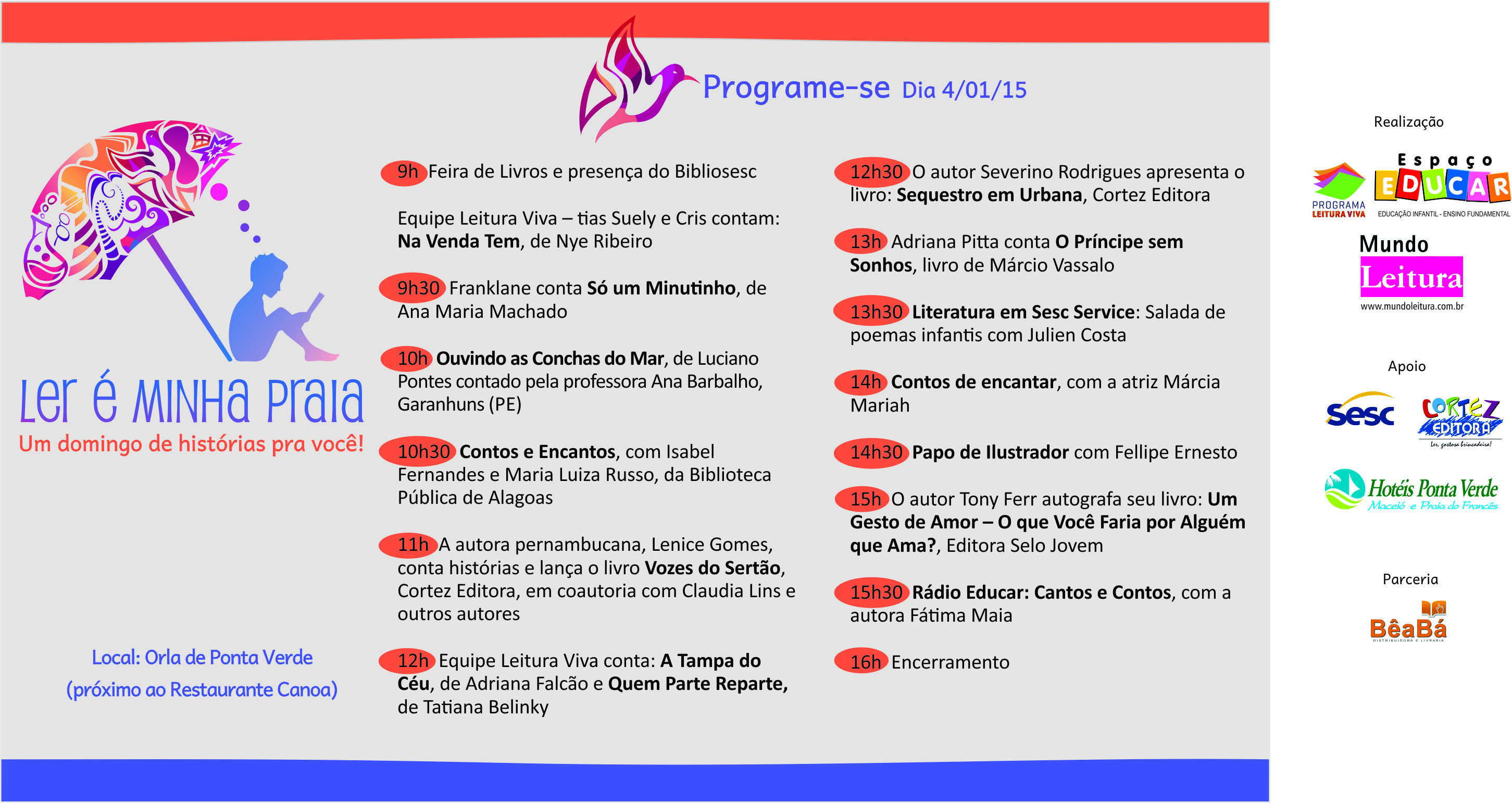O terceiro encontro do Ler é minha praia será no dia 4 de janeiro, a partir das 9h. Haverá contação de histórias e lançamentos de autores e autoras de Alagoas e Pernambuco. Confira a programação!