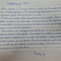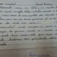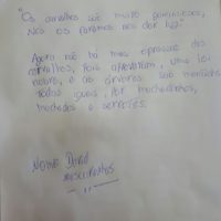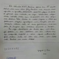 Dois dias para acabar a oficina e eu amando estar na companhia desses jovens. Reconstruí ideias, criei novas possibilidades, vou levar uma vida para a sensação de tudo isso passar… De repente, música virou poesia, poesia virou música e virou história. Notícias de jornal se transformaram em textos de ficção. Foi tão legal compartilhar da empolgação deles… Não resisti a levar para casa o texto de Eduarda que contava as memórias de uma árvore quilombola, tema que ela leu numa reportagem de jornal.