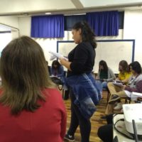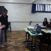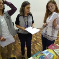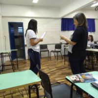Quase que a sessão de vídeos não saiu porque o projetor da escola encrencou, mas o Wodson, “meu caro Wodson”, deu um jeito de fazer o aparelho funcionar. E, apesar dos ruídos, conseguimos assistir a Ddaniela Aguilar contar como acontece o seu processo criativo de imagens e a Claudia Souza, lá da Itália, nos falar sobre como é escrever para crianças.
